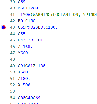 43行目でG65を使ってマクロ(O9023)を呼び出します。O9023が3元座標変換用のマクロプログラムです。その際にBとCを引数に指令し、加工面を指定しています。